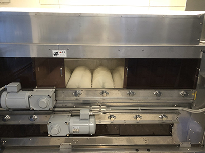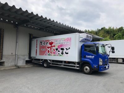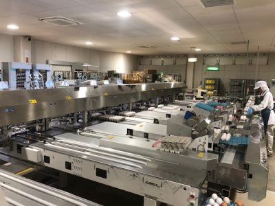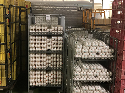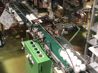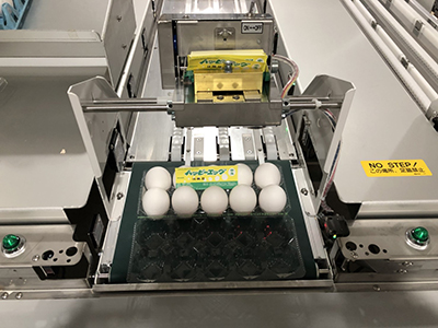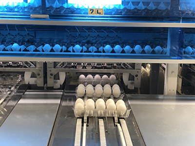 農場から運ばれた卵はオートローダでコンベアに乗せられます。