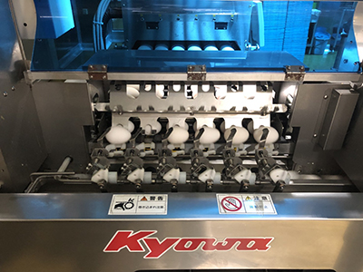 着いたばかりの卵には、汚れやバイキンがたくさんついています。次亜塩素酸という液体をまぜた45度~60度のお湯であらい、ブラシでこすってキレイにします。