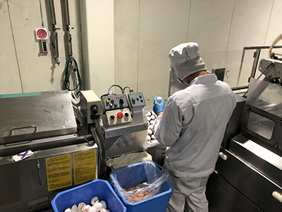 2回目の検査です。卵の下から光を当てて回転させながらヒビ卵・血卵・汚卵をチェックし、とりのぞきます。
